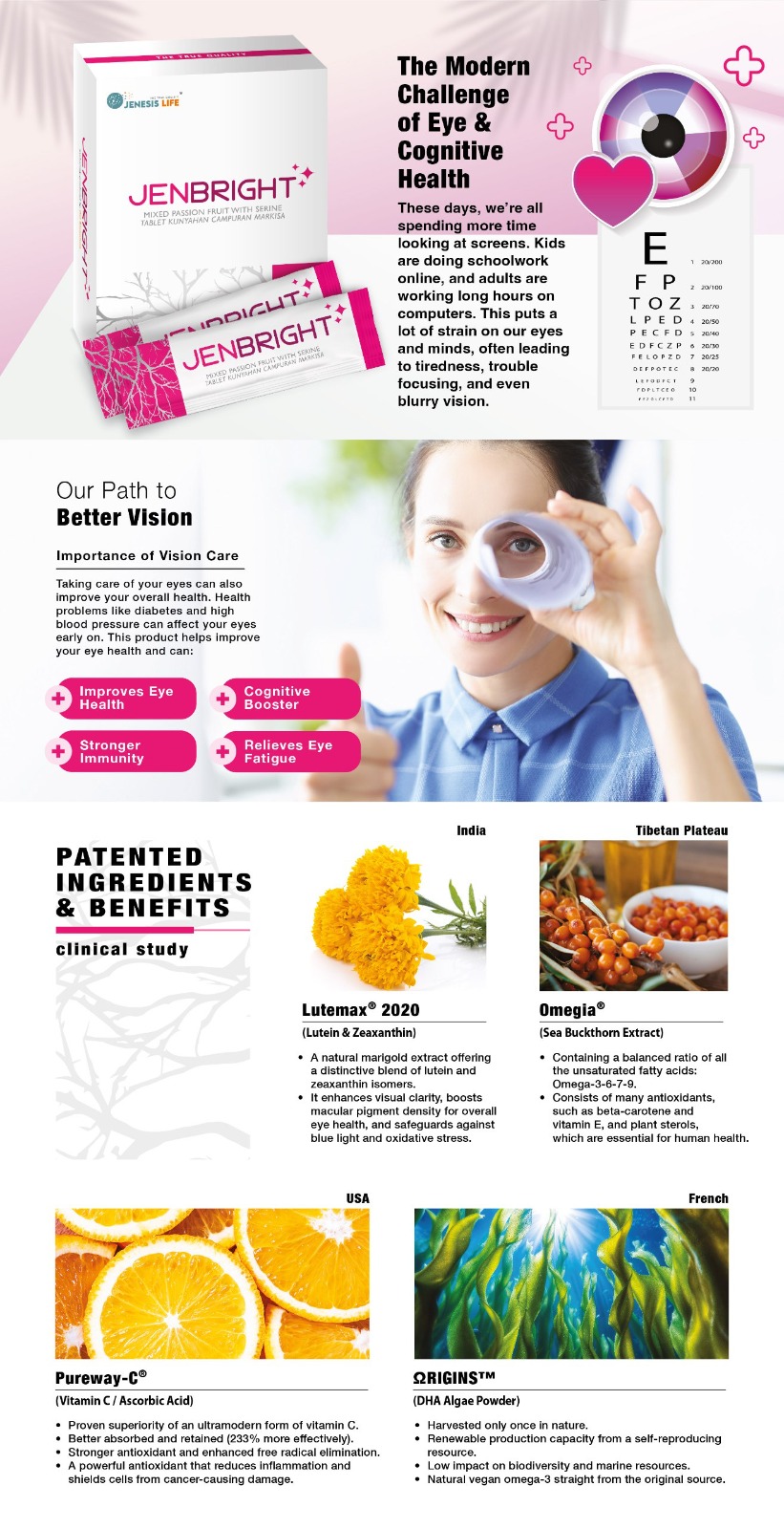 JenBright™ defends sight and brain with Lutemax® 2020 (Lutein & Zeaxanthin), Omegia® (Sea Buckthorn Extract), ΩRIGINS™ DHA Algae Powder, and Pureway-C®.